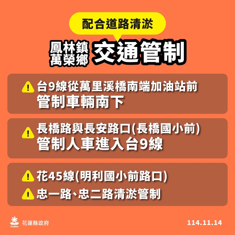 萬榮鄉、鳳林鎮啟動重機具道路清淤相關道路交管