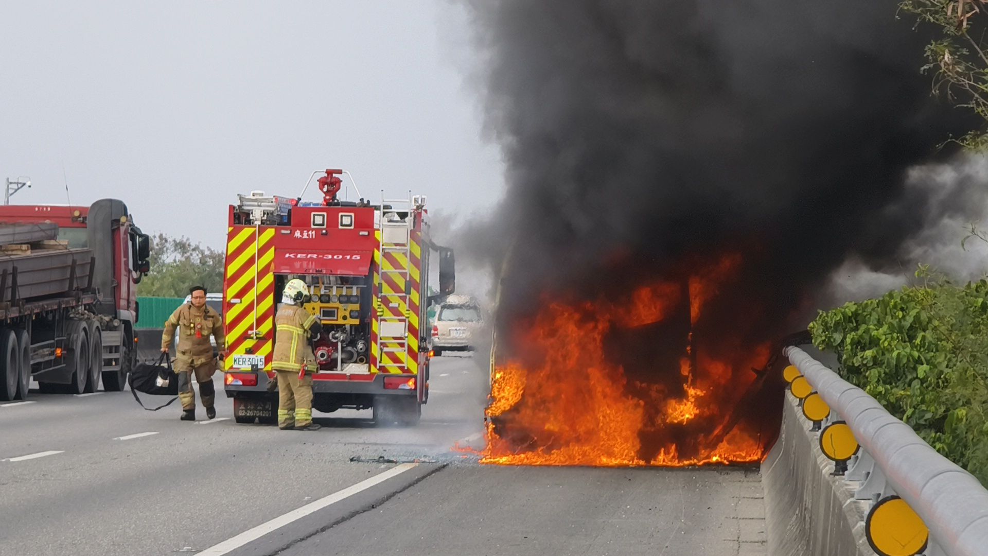 國道一號途中驚魂! 賓士車引擎室起火 火勢失控燒成廢墟