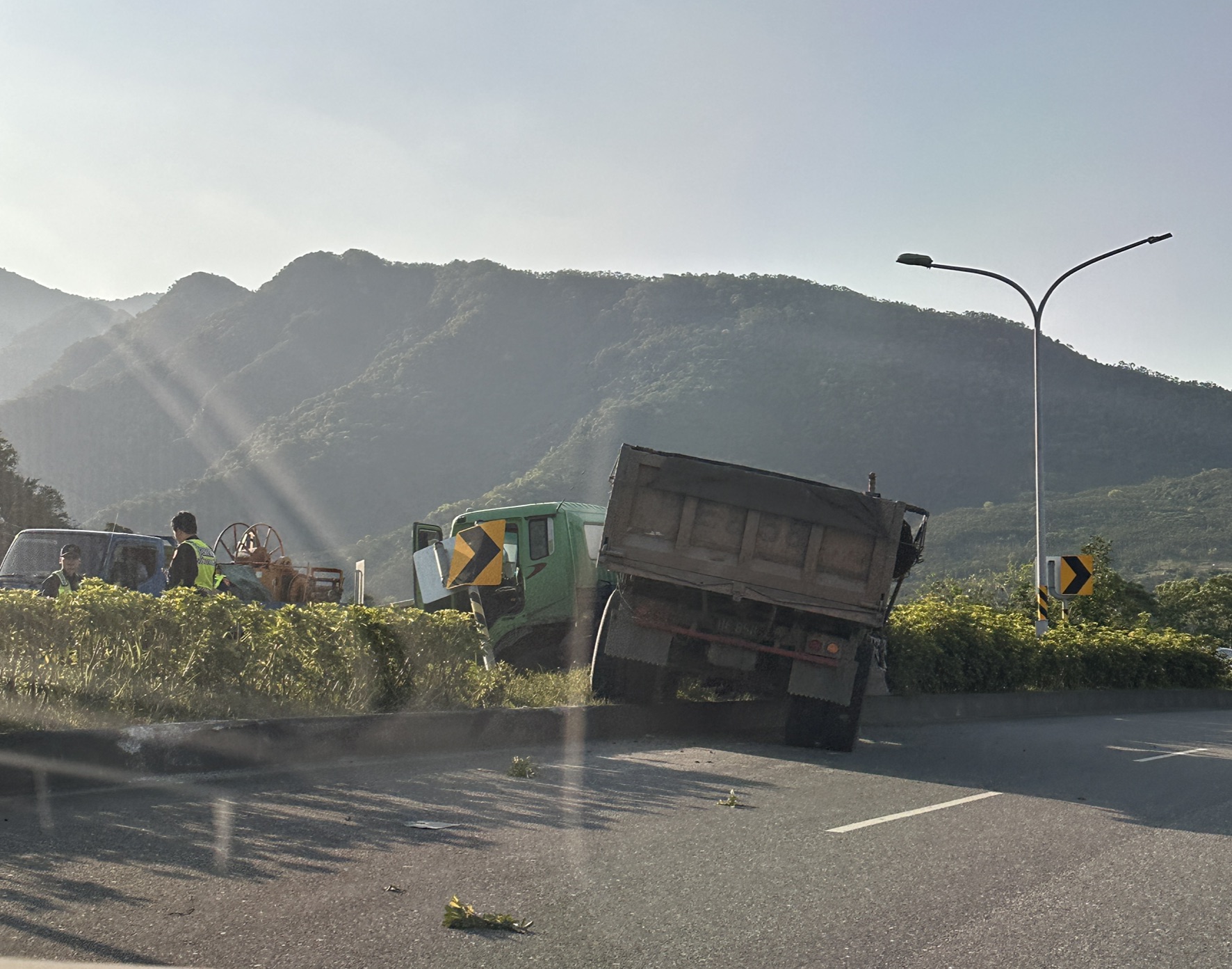 拖曳大卡車「前輪爆胎」失控撞上分隔島 駕駛所幸僅受輕微外傷