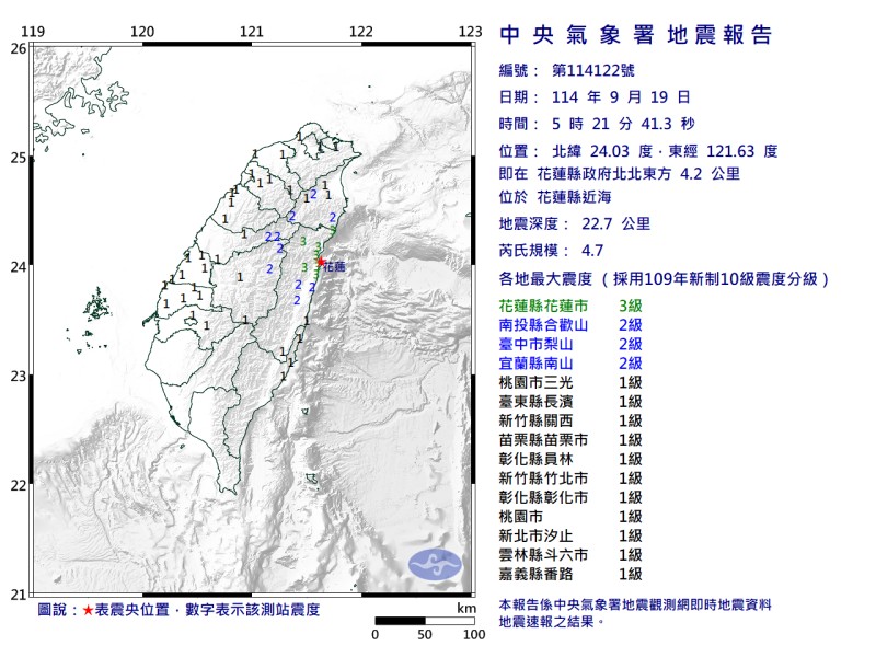 花蓮清晨發生芮氏規模4.7地震
