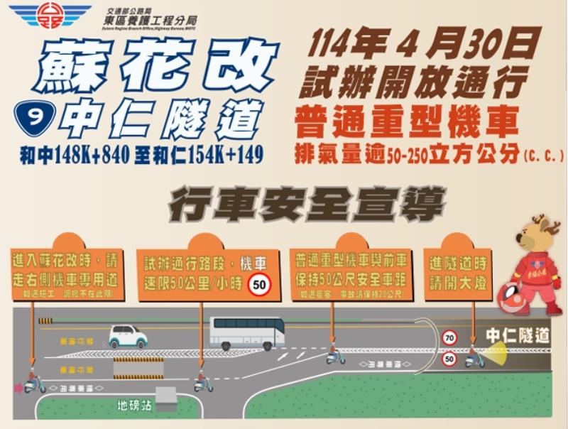 蘇花改中仁隧道4/30起試辦開放普通重型機車通行