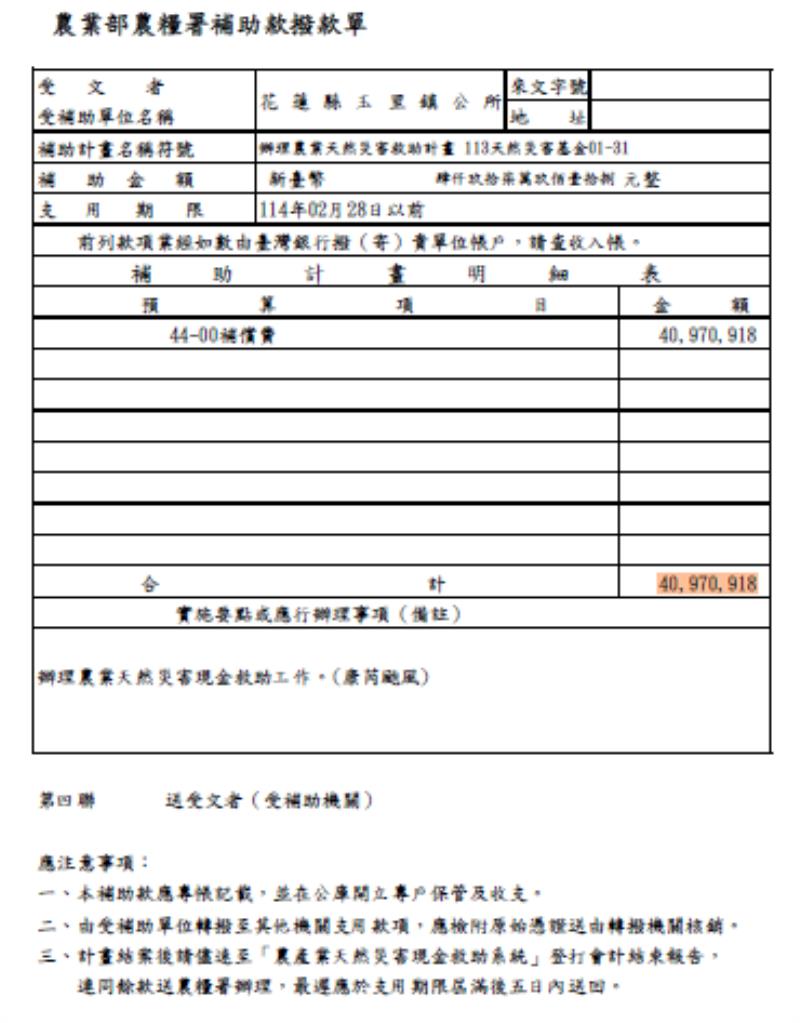 康芮颱風農損救助金新台幣40,970,918元轉入玉里鎮受災戶