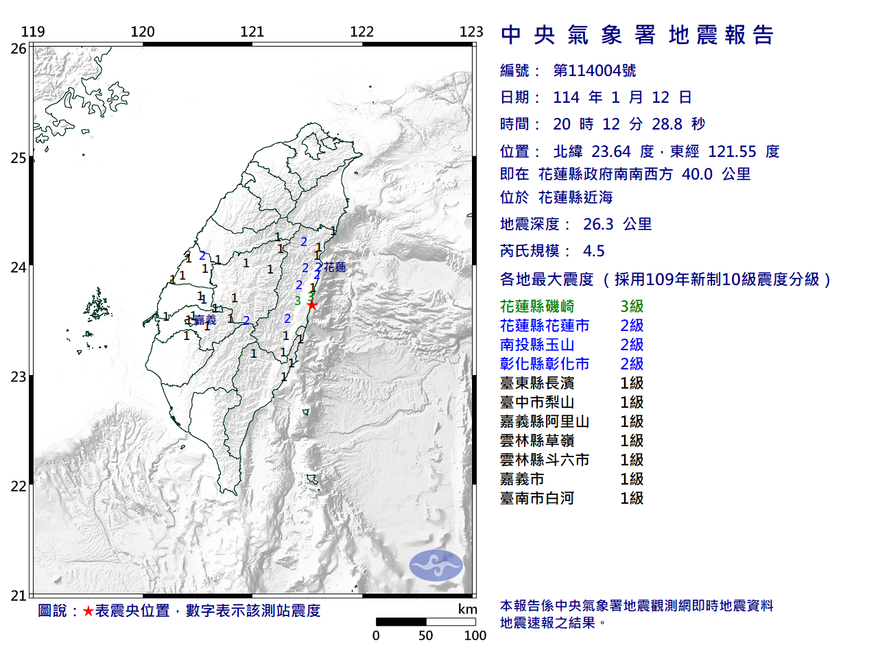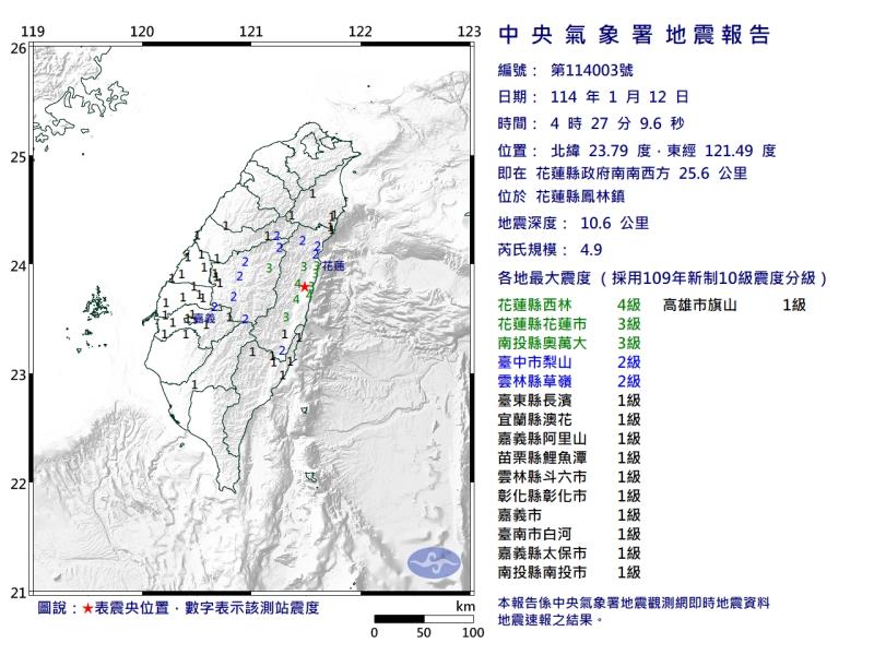 花蓮近海發生規模4.5地震 各地震度一覽