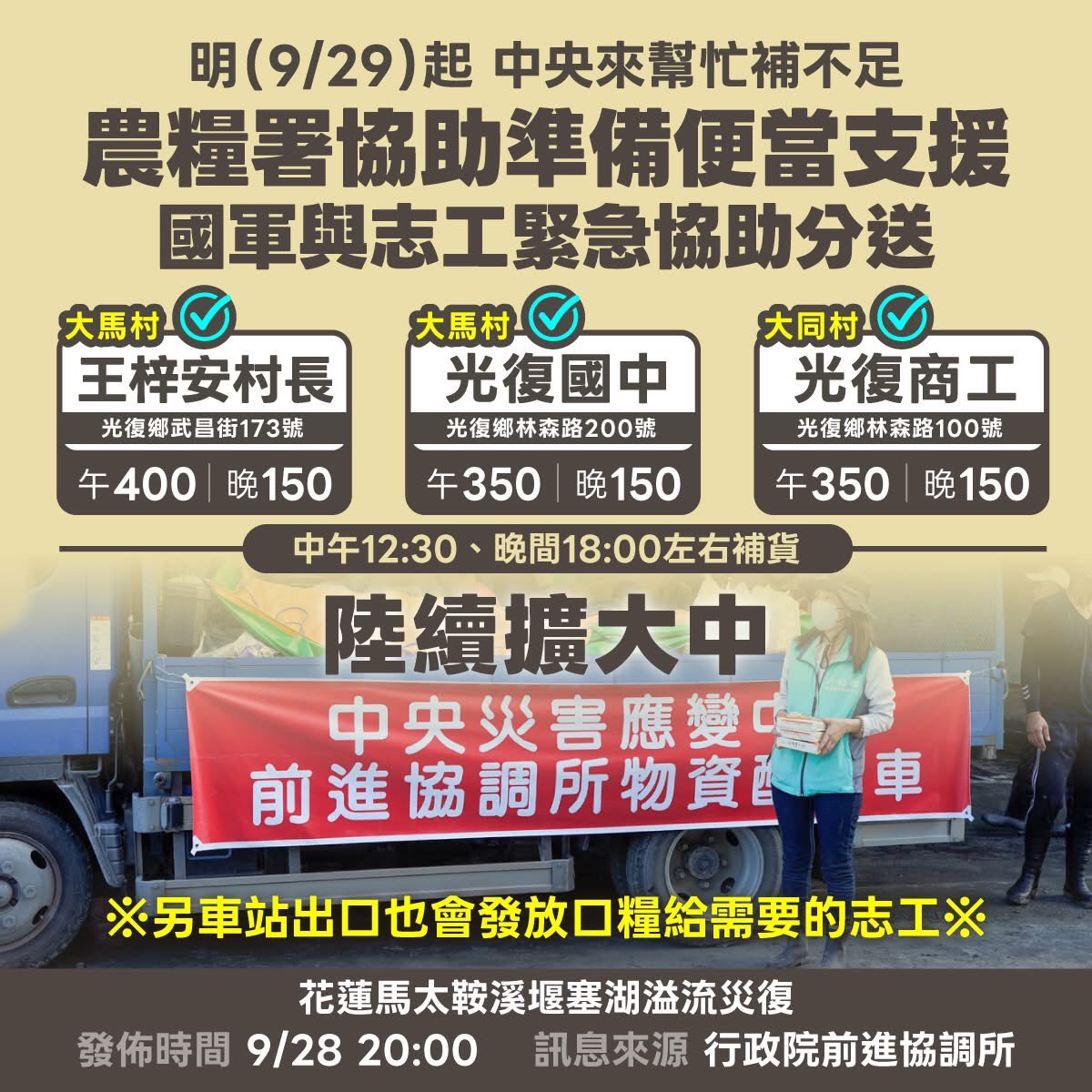 明(29)日起中午、晚間「3定點發放便當」! 農糧署 : 讓第一線救災人員、志工們 有足夠體力