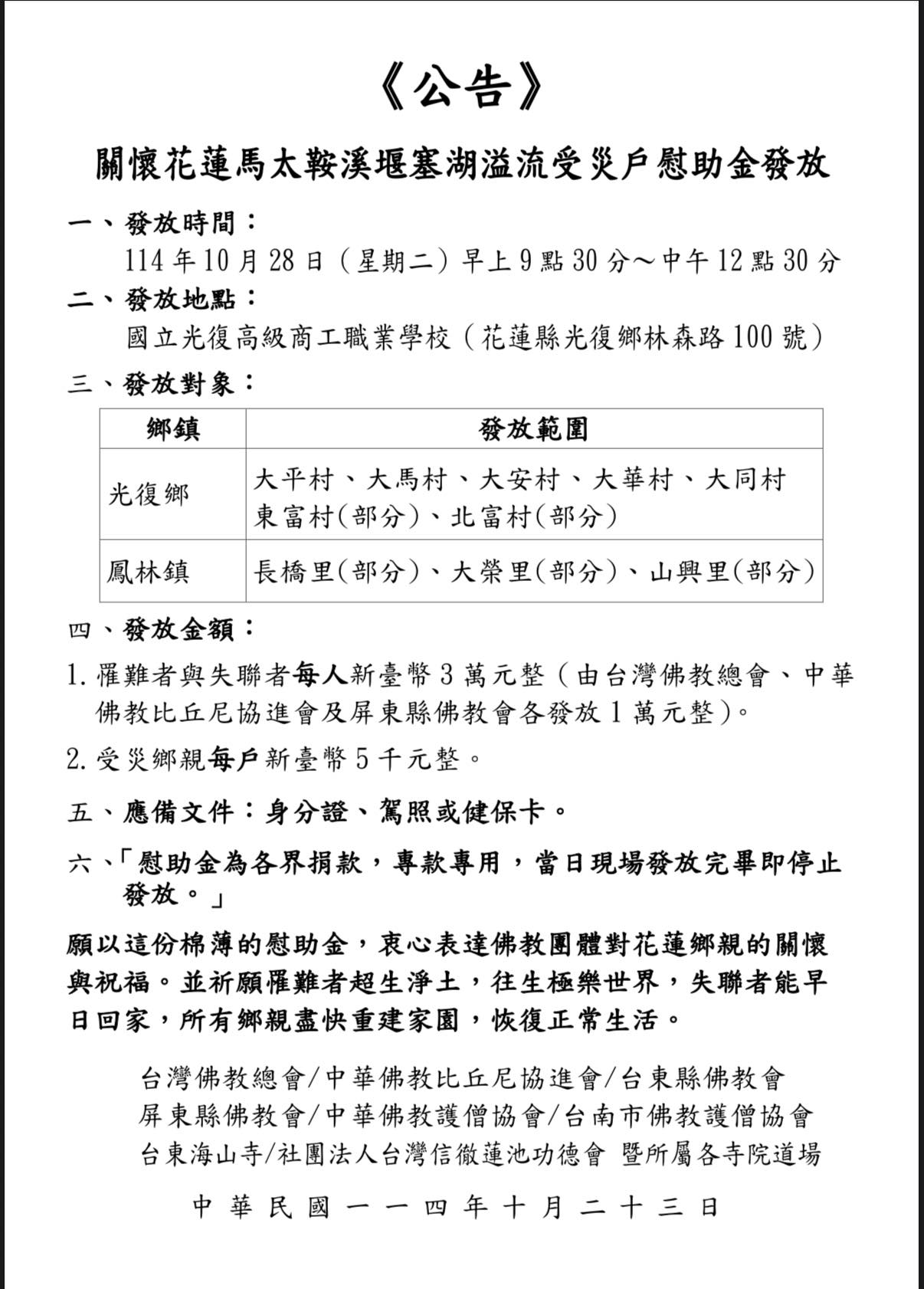 罹難與失聯者每人3萬元、受災戶每戶5,000元 ! 佛教團體10/28上午將於國立光復商工發放「慰助金」