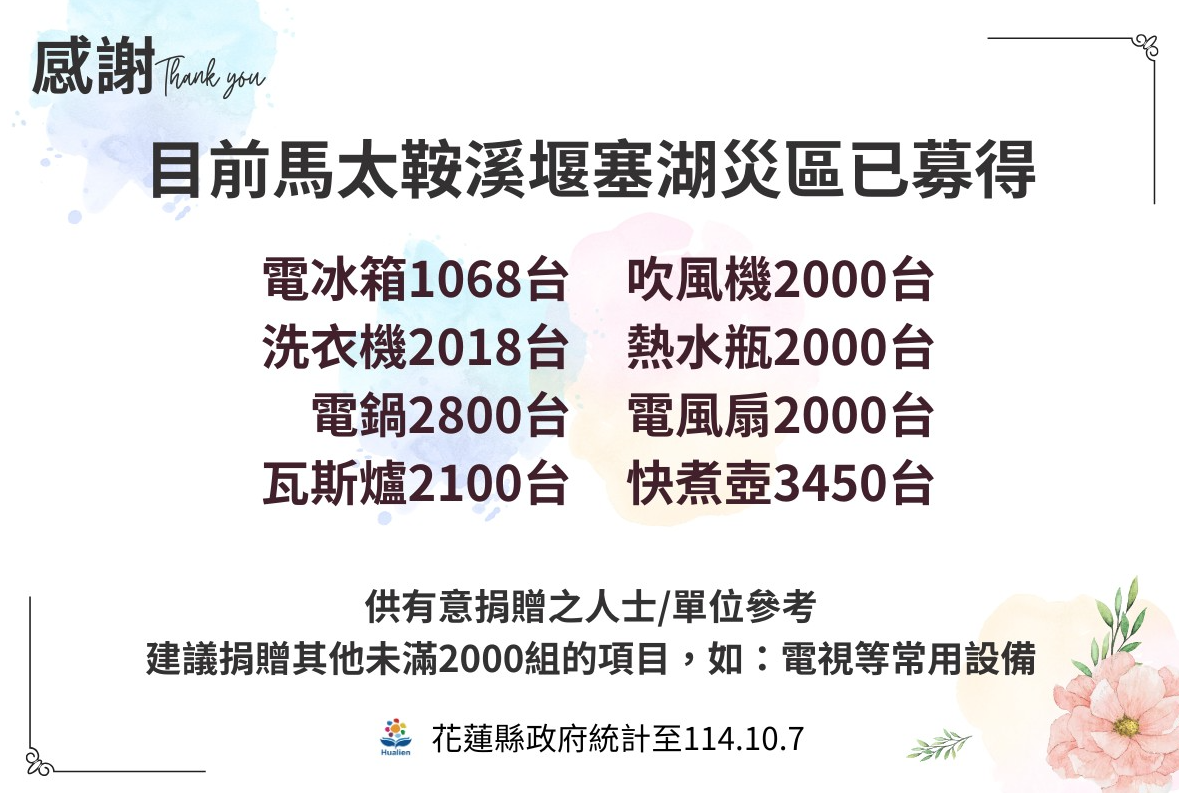 縣府公布馬太鞍堰塞湖災區「家電捐贈統計」多項家電達2000份