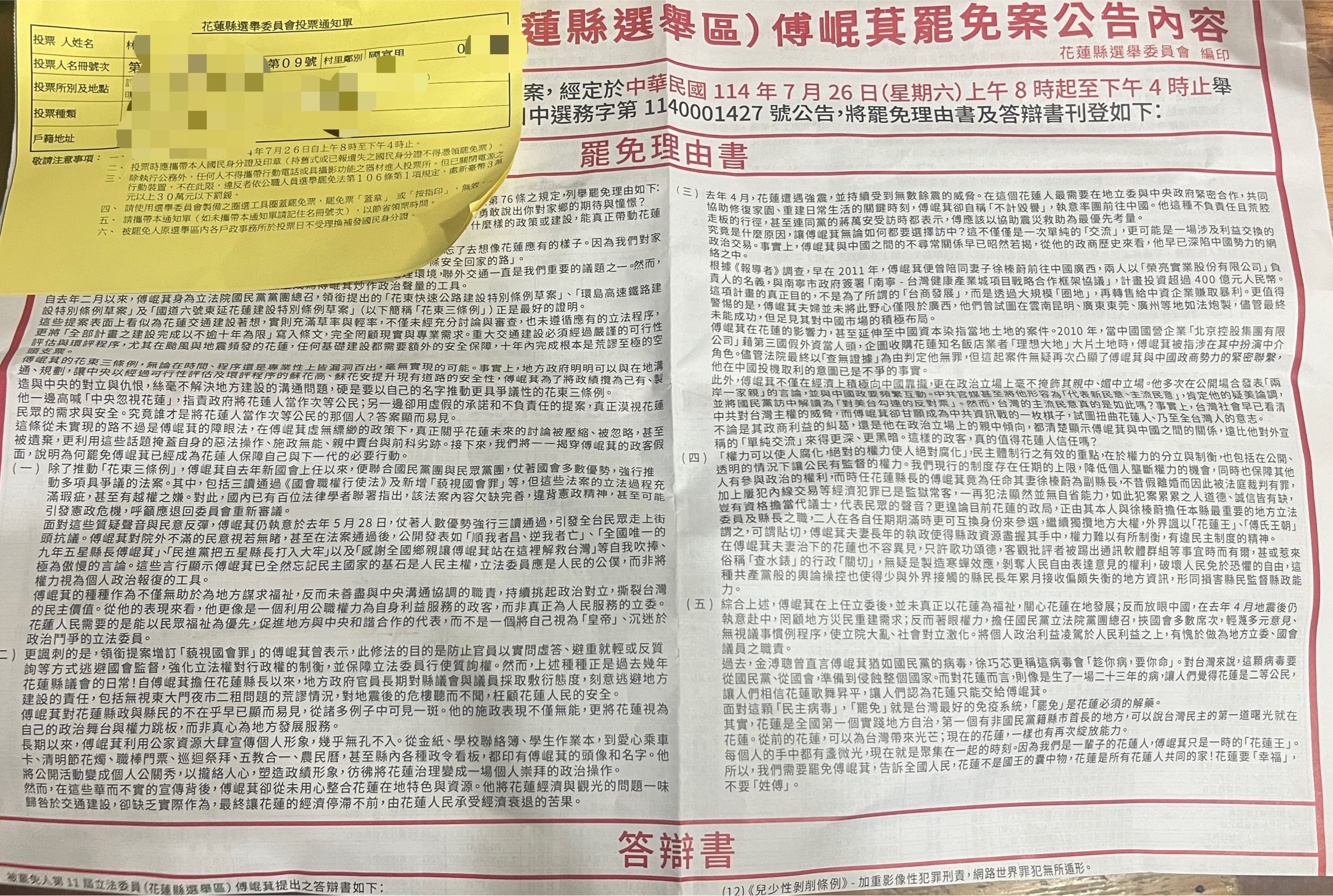 「罷免公報夾文宣」遭質疑 花蓮選委會澄清:依法分送、無夾帶情事