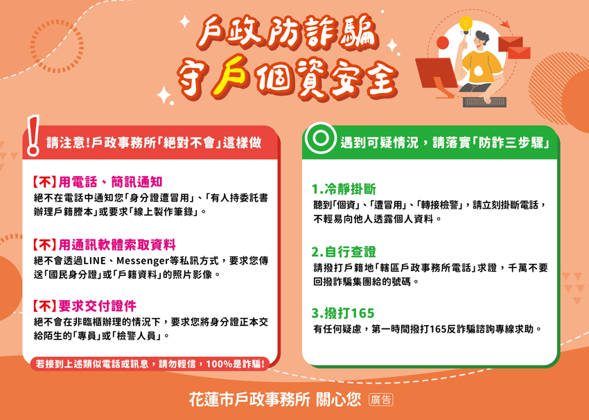 假冒「戶政」詐騙再起 花蓮市戶政事務所籲民眾提高警覺