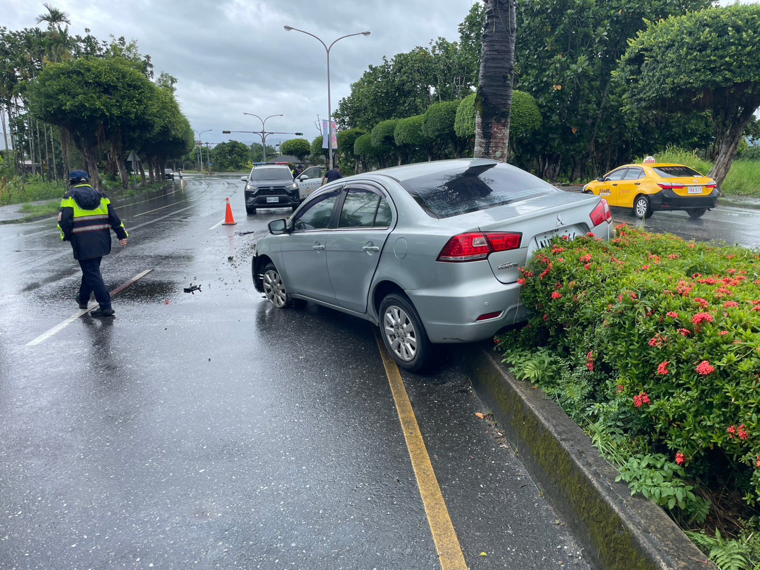 颱風暴雨路面積水 ! 小客車打滑自撞分隔島 駕駛手腳擦挫傷